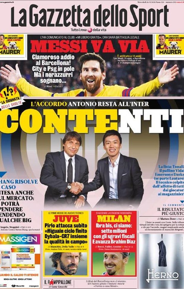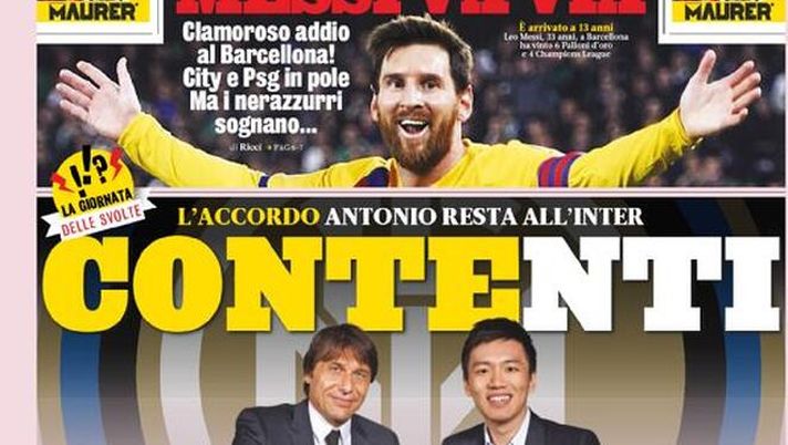 "Sotto la testata si parla del clamoroso addio di Lionel Messi al Barcellona. PSG e Manchester City in pole position sull'argentino, ma l'Inter sogna.