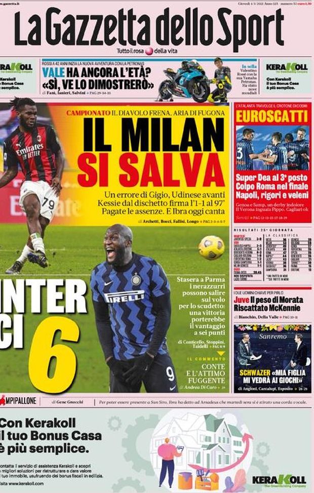 "'La Gazzetta dello Sport' in edicola questa mattina, in copertina, dedica ampio spazio a Milan ed Inter. I rossoneri, infatti, non vanno oltre l'1-1 interno contro l'Udinese. Un rigore di Franck Kessié al 97' salva la squadra di Stefano Pioli dalla sconfitta.