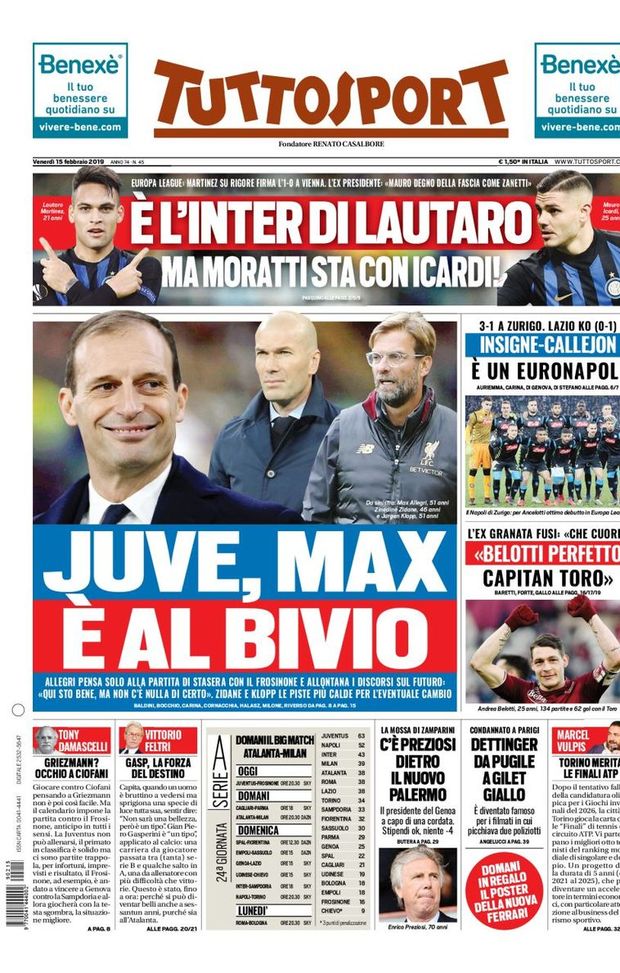 L’ edicola – 15 febbraio 2019: le prime pagine dei quotidiani sportivi