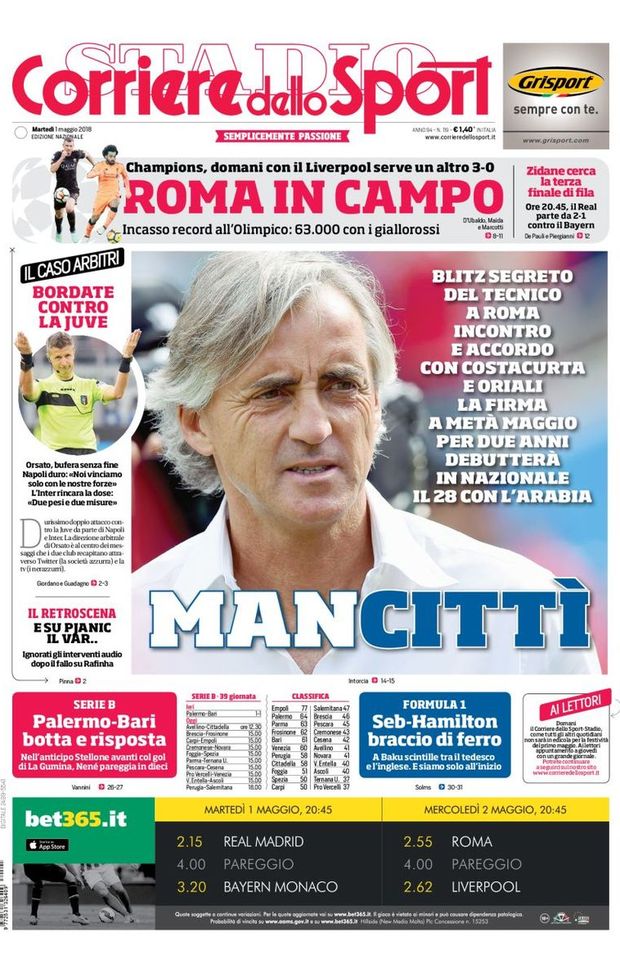 "Il 'Corriere dello Sport - Stadio' dedica la sua prima pagina a Roberto Mancini, che avrebbe detto sì, in un incontro segreto con i vertici federali, alla panchina della Nazionale Italiana: sarà Commissario Tecnico azzurro tra poco più di due settimane e, alla fine di questo mese, dovrebbe debuttare contro l'Arabia Saudita. Sul quotidiano romano si parla anche della bufera intorno Daniele Orsato e delle bordate contro la Juventus, nonché di Champions League: domani sera, a Roma, per la sfida dell'Olimpico contro il Liverpool, previsti 63mila tifosi giallorossi. Si sogna un altro 3-0 dopo quello inflitto nel turno precedente di coppa al Barcellona.