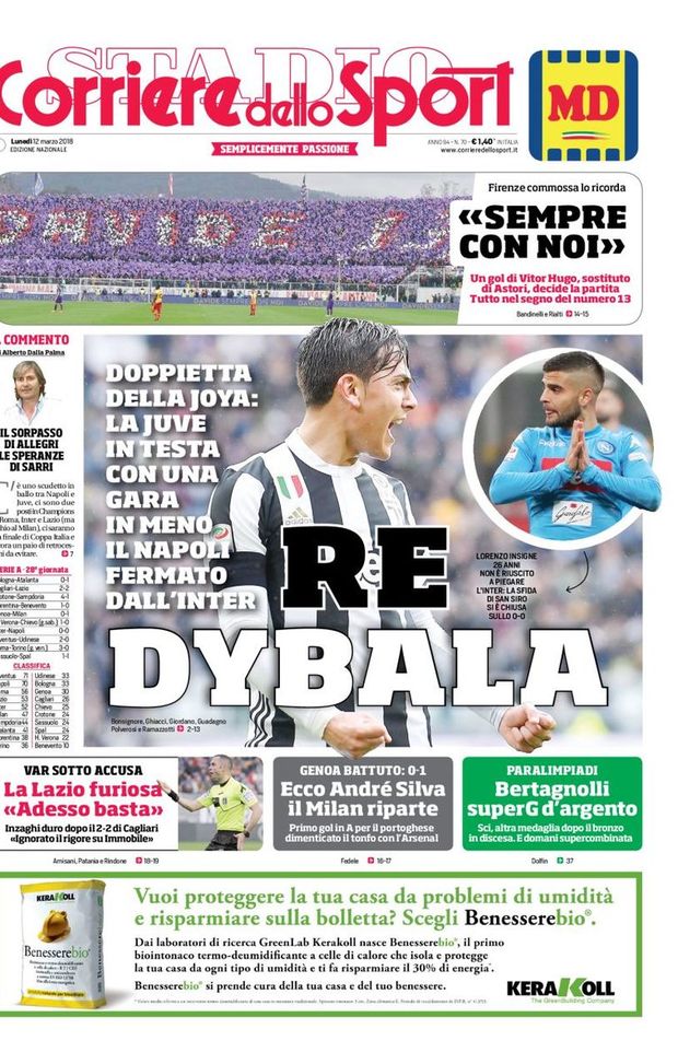 Anche il Corriere dello Sport apre ovviamente con il sorpasso juventino. In particolare la copertina è dedicata a Paulo Dybala. L'argentino viene considerato "Re" dopo la doppietta all'Udinese che ha consentito alla Juventus di mettere le mani sul primo posto in classifica. In alto si parla di Astori, "Sempre con noi". Di taglio basso, invece, ecco la magia di André Silva, che permette al Milan di ripartire con il primo gol in Serie A, arrivato all'ultimo secondo. Infine spazio anche alle proteste della Lazio per il VAR.