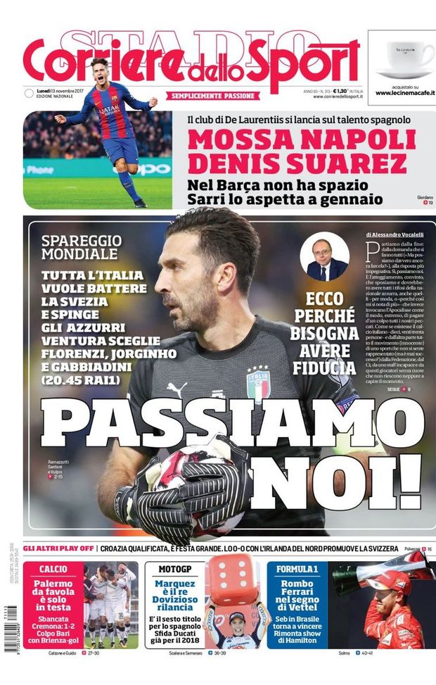 Il Corriere dello Sport apre con un profetico: "Passiamo noi!" Un'eliminazione sarebbe una catastrofe calcistica. Non capita dal 1958. A San Siro saranno 75.000 e da casa quasi tutto il Paese. Il match è decisivo, probabilmente il più importante degli ultimi cinque anni. Serve vincere con due gol di scarto per poter giocare in Russia. Anche sul quotidiano romano, comunque, non c'è traccia di Milan in prima pagina, come preventivabile.