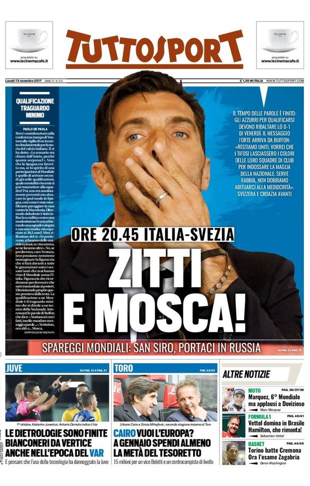 Anche Tuttosport dedica la prima pagina al match di oggi tra Italia e Svezia: "Zitti e mosca" è il titolo del quotidiano torinese. Il capitano Gianluigi Buffon suona la carica e spera di poter giocare il suo ultimo Mondiale. Servirà una piccola impresa, ma l'Italia può farlo. Di taglio basso, risposta alle polemiche e alle dietrologie: "Anche nell'epoca del VAR la Juventus è da vertice". I bianconeri, infatti, si trovano al secondo posto in classifica. Anche in questo caso neanche un accenno ai colori rossoneri.