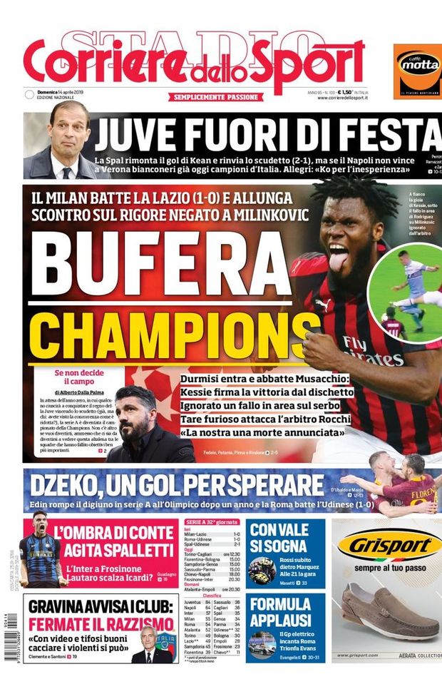 Anche il Corriere dello Sport apre con la partita di ieri sera tra Lazio e Milan, ma con focus sulle polemiche arbitrali della Lazio: "Bufera Champions" è il titolo del quotidiano romano, secondo cui ci sarebbe un fallo di Ricardo Rodriguez su Sergej Milinkovic-Savic in area di rigore. In realtà lo svizzero colpisce prima il pallone. In ogni caso, tra punti d'oro per il Milan che allunga sui biancocelesti.