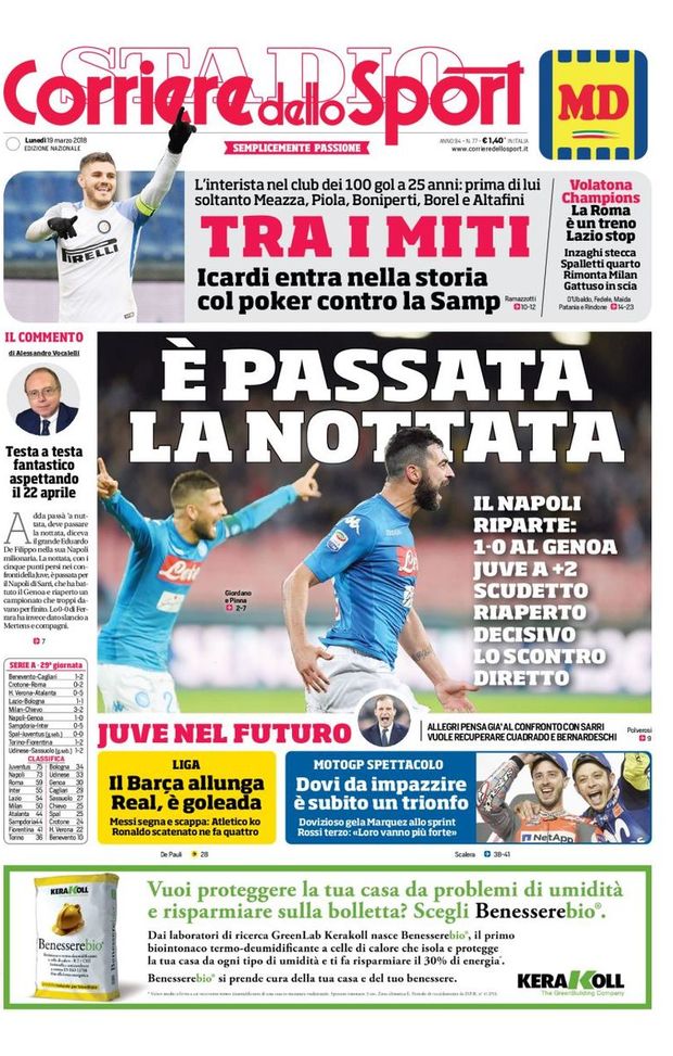 Il 'Corriere dello Sport - Stadio' apre proprio con la vittoria del Napoli: la rete di testa del difensore spagnolo Raúl Albiol consente al Napoli di arrivare a -2 dalla Juventus. 'La nottata', dalle parti di Castelvolturno, sembra essere definitivamente alle spalle. Nel taglio alto del quotidiano romano, invece, spazio al successo roboante dell'Inter di Luciano Spalletti a 'Marassi' contro la Sampdoria: una gara decisa dal ciclone Mauro Icardi (4 gol). Calcio estero: il Barcellona allunga in vetta nella Liga spagnola, ma il Real Madrid vince in goleada (6-3) sul Girona.