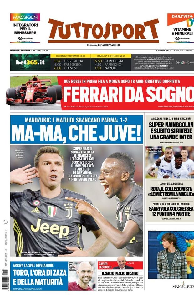 "L'edizione odierna di 'Tuttosport', infine, dedica la prima pagina, alla Juventus, che ha sbancato per 2-1 il 'Tardini' di Parma grazie alle reti di Mario Mandžukić e Blaise Matuidi. Spazio, nel riquadro verticale, all'Inter vittoriosa a Bologna trascinata da Radja Nainggolan ed al Chelsea di Maurizio Sarri, che ha iniziato la Premier League vincendo 4 gare su 4. Infine, nel taglio basso, si parla del Torino di Walter Mazzarri, dove, finalmente, sembra essere scoccata l'ora di una maglia da titolare per Simone Zaza.