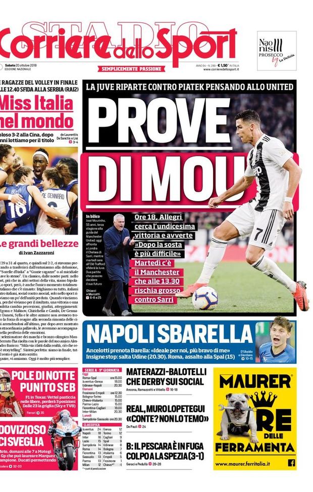 Il "Corriere dello Sport", invece si concentra sulla gara di quest'oggi tra Juventus e Udinese, con il Manchester United, prossimo avversario dei bianconeri in Champions League, che affronteranno alle 13:30 il Chelsea di Maurizio Sarri. In basso spazio al mercato, con il Napoli che è interessato a Nicolò Barella.