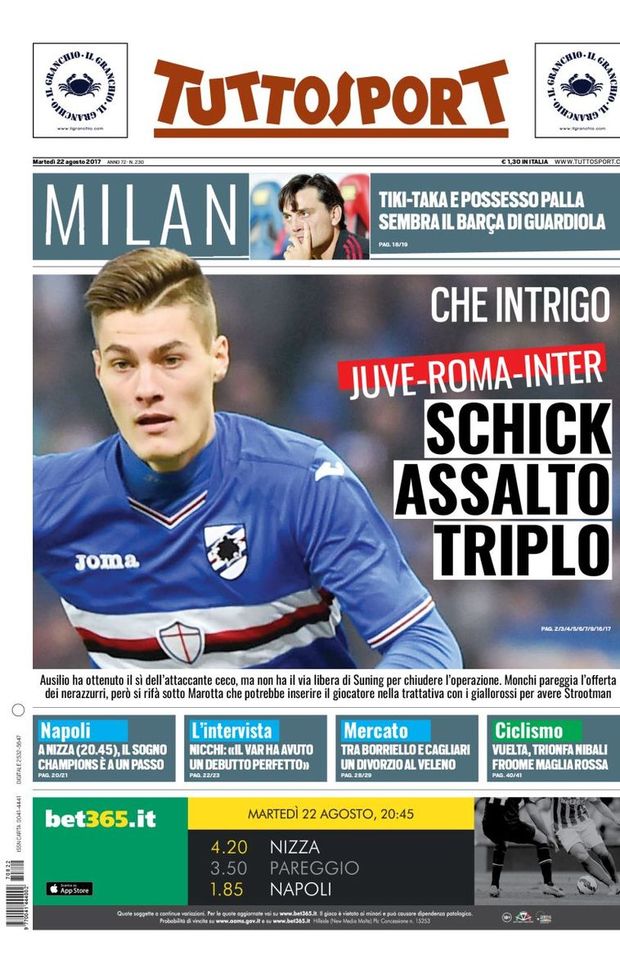 Anche Tuttosport dedica la prima pagina a Patrik Shick: oltre però a Roma e Inter, ci sarebbe nuovamente l'interesse della Juventus, dopo i problemi riscontrati in passato con le visite mediche. Spazio anche al Milan, visto che viene esaltato il gioco di Vincenzo Montella: il paragone è con quello del Barcellona di Guardiola