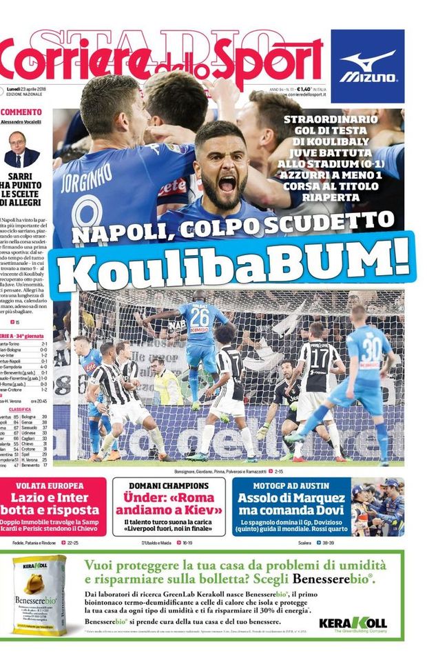 "Anche il 'Corriere dello Sport - Stadio' dedica la sua prima pagina a Juventus-Napoli, definendo la vittoria degli azzurri di Maurizio Sarri a Torino un "colpo Scudetto". Quindi, anche il quotidiano romano parla della volata Champions, con Lazio (4-0 sulla Sampdoria) e Inter (2-1 al 'Bentegodi' contro il Chievo Verona) capaci di rispondere ad una Roma attesa mercoledì sera dalla semifinale di andata di Champions League a Liverpool. Ha parlato, a questo proposito, il turco Cengiz Ünder, carico a mille e convinto di approdare alla finalissima di Kiev.