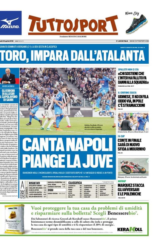 "L'edizione odierna di 'Tuttosport', infine, descrive così la sconfitta interna dei bianconeri: "Canta Napoli, piange la Juve". In prima anche il commento del neo-direttore di 'Tuttosport', lo stimato Xavier Jacobelli. Nel riquadro verticale, le parole di Luciano Spalletti dopo Chievo-Inter, la possibilità di vedere l'ex nerazzurro Andrea Stramaccioni sulla panchina dell'Udinese al posto di Massimo Oddo e l'approdo del Chelsea di Antonio Conte nella finale della F.A. Cup inglese, laddove sfiderà il Manchester United di José Mourinho.