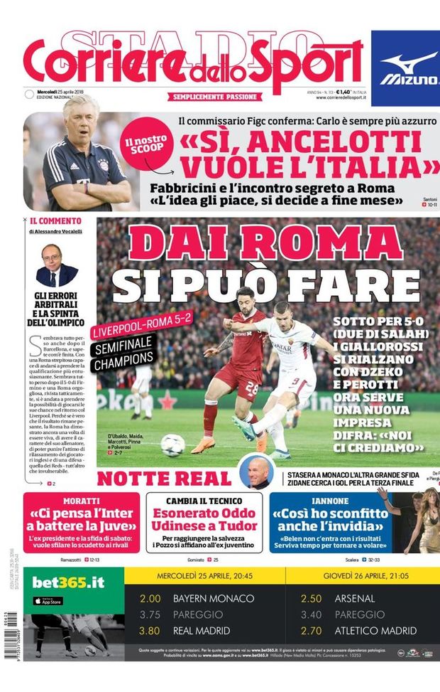 "Anche il 'Corriere dello Sport - Stadio' dedica ovviamente la sua prima pagina a Liverpool-Roma, con Di Francesco che crede nella qualificazione alla finale, anche se nella gara di ieri sono stati commessi tanti errori da parte della squadra giallorossa. Nel taglio basso, vediamo l'esonero di Oddo, che paga la sconfitta interna contro il Crotone: la panchina dell'Udinese è affidata a Tudor.