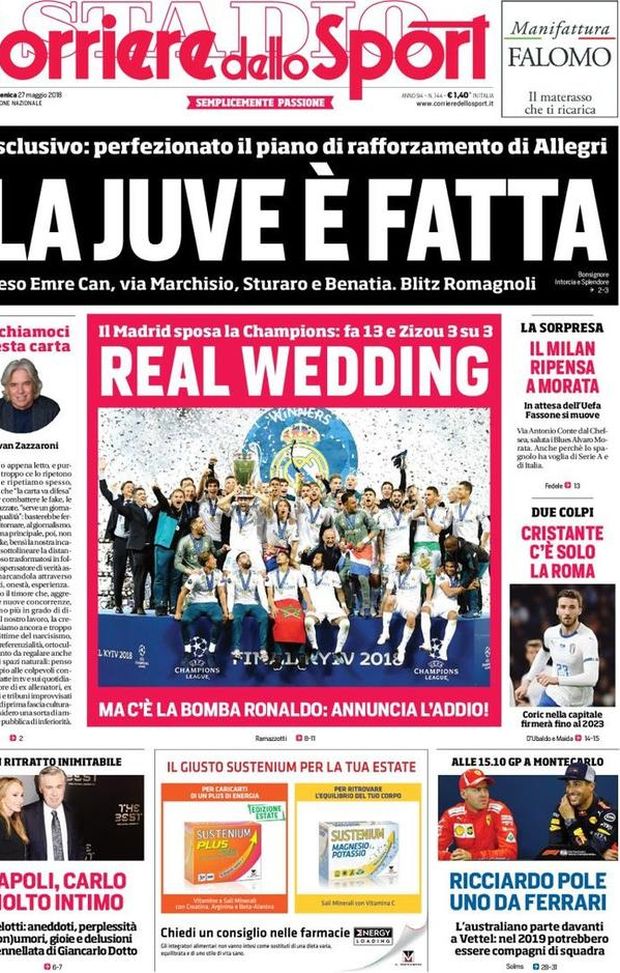 "Spazio alla finale di Kiev anche sul Corriere dello Sport, che dedica un'ampia sezione al mercato della Juventus: "Preso Emre Can, via Marchisio, Sturaro e Benatia. Blitz Romagnoli". Nei tagli laterali, invece, ecco un'altra ipotesi di mercato: "Il Milan ripensa a Morata".