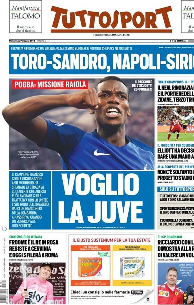 "C'è Paul Pogba in prima pagina sull'edizione odierna di Tuttosport: "Voglio la Juve" si legge. Nnel trafiletto laterale, spazio alla finale di Kiev e alla situazione societaria del Milan: "Elliott ha deciso: vuole dare una mano al Milan"