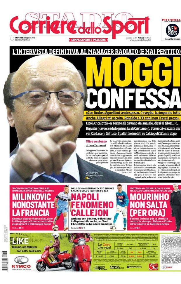 Il 'Corriere dello Sport - Stadio' dedica la sua copertina all'intervista esclusiva realizzata con Luciano Moggi, ex dirigente della Juventus, che ha parlato a 360° sul mondo del calcio, dedicando anche un passaggio all'allenatore del Milan, Gennaro Gattuso. In basso, poi, il quotidiano romano parla del 'no' di Sergej Milinković-Savić al trasferimento al PSG, di José Maria Callejón del Napoli, quasi sempre presente in ogni partita dei partenopei, e dell'avvio shock di José Mourinho, in questa stagione, alla guida del Manchester United.