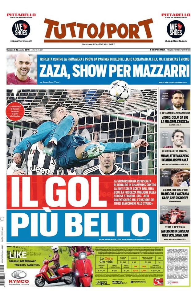 L'edizione odierna di 'Tuttosport', infine, dedica la prima pagina, naturalmente, a Cristiano Ronaldo, ed alla rete messa a segno contro la 'sua' Juventus, nello scorso mese di aprile, all'Allianz Stadium contro il Real Madrid. Nel taglio alto, si parla del Torino: tripletta di Simone Zaza nel test contro la Primavera, mentre scalpita per un posto anche Adem Ljajić, sul quale, però, continua a premere il Beşiktaş. Nel riquadro verticale, infine, l'intervista al D.S. della S.P.A.L., Davide Vagnati, l'arrivo di Ricardo Kakà a Milano mentre i rossoneri aspettano il sì di Ivan Gazidis per la dirigenza e un ritratto di Emiliano Rigoni, nuovo gioiello dell'Atalanta.