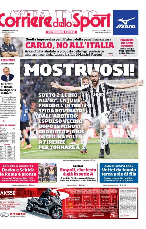 "Il 'Corriere dello Sport - Stadio' esalta la Juventus, che sembra ormai ad un passo da cedere il primo posto in campionato al Napoli, quest'oggi sfiderà in trasferta la Fiorentina. Nel taglio alto spazio a Carlo Ancelotti, che non sarà il prossimo commissario tecnico della Nazionale Italiana, mentre in quello basso spazio alla Roma, che batte agevolmente per 4 a 1 il Chievo Verona di Rolando Maran.