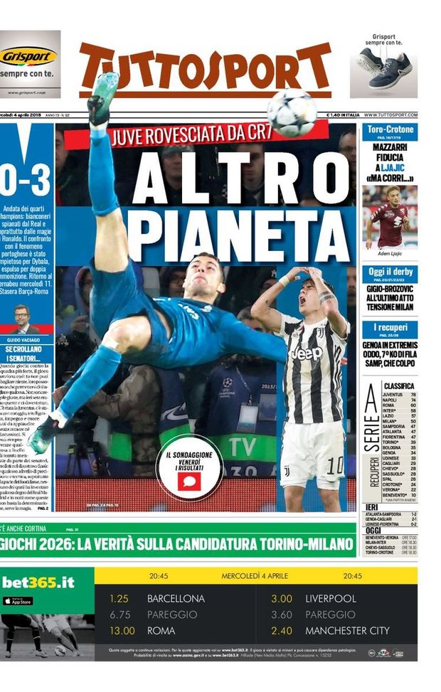 "Persino l'edizione odierna di 'Tuttosport', infine, si arrende allo strapotere di Cristiano Ronaldo e del Real Madrid sulla Vecchia Signora. "Juve rovesciata da CR7", ha scritto il quotidiano torinese, definendo l'attaccante portoghese "di un altro pianeta". La Juventus, nella débacle contro i 'Blancos', ha pagato anche la serataccia di Paulo Dybala, espulso ed indisponibile nel match di ritorno. Nel riquadro verticale, si parla anche del derby di Milano: Gianluigi 'Gigio' Donnarumma e Marcelo 'Epic' Brozović sarebbero al loro ultimo atto in una stracittadina meneghina.