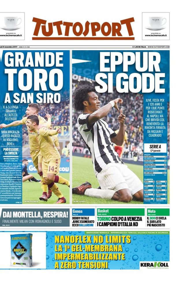 "Sull'edizione odierna di 'Tuttosport' prima pagina per le due squadre di Torino. Ampio risalto, infatti, viene dato al pareggio (1-1) dei granata di Siniša Mihajlović in casa dell'Inter (era stato illusorio il gol di Iago Falque): la strada intrapresa dal Toro sembra essere quella giusta. Ma spazio viene concesso anche alla Juventus che, sebbene superi il Benevento tra mille difficoltà, alla fine può godere per una classifica che le torna a sorridere. Nel taglio basso, spazio al Milan, vittorioso 2-0 in casa del Sassuolo: Vincenzo Montella può tornare a respirare aria di conferma.