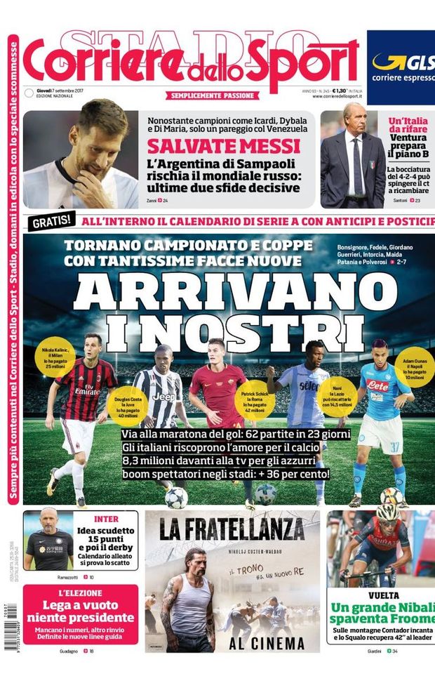 "Sulla prima pagina del 'Corriere dello Sport - Stadio' oggi in edicola, al contrario, si celebra il ritorno del campionato di Serie A nell'imminente weekend: ci aspettano ben 62 partite in 23 giorni, con gli italiani che, allo stadio o davanti alla TV, hanno riscoperto l'amore per il calcio. Nel taglio alto, spazio alla crisi dell'Argentina di Jorge Sampaoli, incapace di superare in casa il Venezuela ed a rischio qualificazione mondiale. Trafiletto sull'Inter, che vuole fare 15 punti nelle prossime 5 giornate e presentarsi nel miglior modo possibile al derby con il Milan.