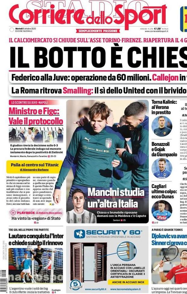 "ULTIME NOTIZIE MILAN NEWS - Il 'Corriere dello Sport' oggi in edicola, in copertina, parla della conclusione del calciomercato 2020. Il botto è rappresentato da Federico Chiesa, che passa dalla Fiorentina alla Juventus per 60 milioni di euro totali tra prestito oneroso biennale ed obbligo di riscatto. In viola approda lo svincolato José Maria Callejón. Intanto, Chris Smalling è tornato alla Roma. Invece Nikola Kalinić, ex centravanti del Milan, ha firmato per l'Hellas Verona. Colpo Adam Ounas per il Cagliari. Si parla, in prima pagina, anche di Lautaro Martínez, centravanti dell'Inter, che chiede il rinnovo di contratto alla società nerazzurra.