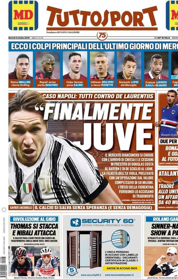 "ULTIME NOTIZIE MILAN NEWS - 'Tuttosport' dedica la sua prima pagina, quasi per intero, al trasferimento di Federico Chiesa dalla Fiorentina alla Juventus. Operazione resa possibile dalle cessioni di Daniele Rugani al Rennes, di Mattia De Sciglio all'Olympique Lione e di Douglas Costa al Bayern Monaco: tutte con la formula del prestito secco. Chiesa felice, i tifosi della Fiorentina furibondi con il loro ex idolo. In alto, sotto la testata, carrellata di tutti i principali colpi dell'ultimo giorno del calciomercato 2020. I più importanti? Chris Smalling alla Roma, poi Tiémoué Bakayoko al Napoli, quindi Nikola Kalinić all'Hellas Verona, ma occhio alle sorprese. Il Torino prende Federico Bonazzoli e Amer Gojak, mentre l'Atalanta ha ceduto Amad Traoré al Manchester United.