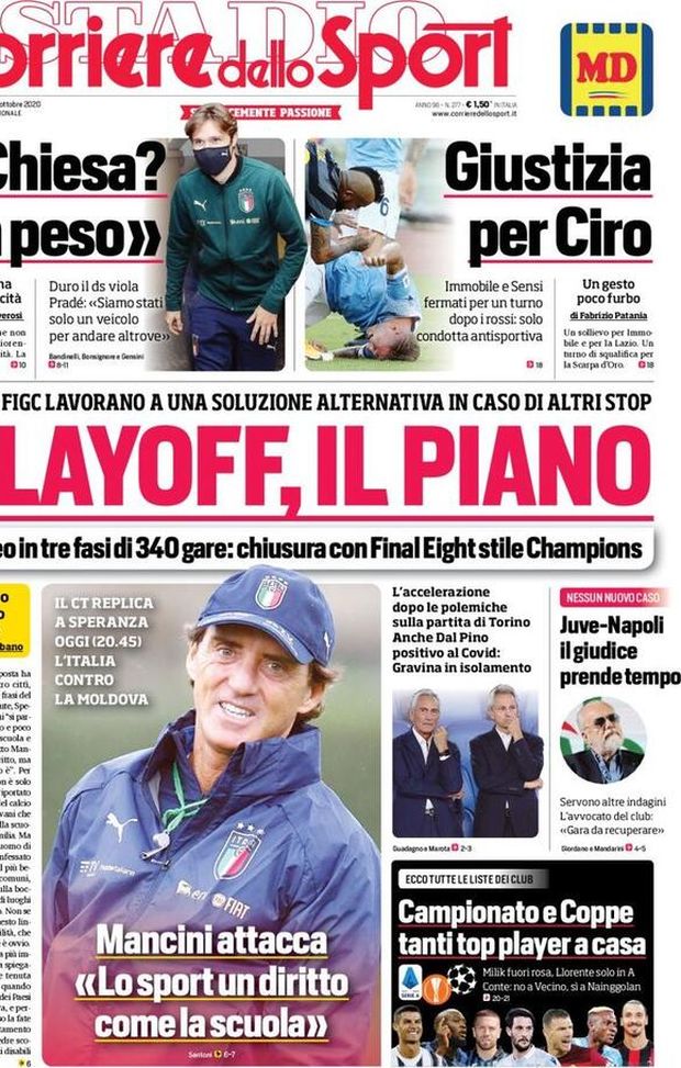 "ULTIME NOTIZIE MILAN NEWS - Il 'Corriere dello Sport' in edicola questa mattina, tra i giornali, è quello che parla di un piano playoff per terminare il campionato di Serie A in caso di nuove problematiche sanitarie. Il tutto mentre Roberto Mancini, Commissario Tecnico della nostra Nazionale, ha attaccato il Ministro della Salute, Roberto Speranza, alla vigilia di Italia-Moldova. In alto, sotto la testata, le parole di Daniele Pradè, direttore sportivo della Fiorentina, molto duro nei confronti di Federico Chiesa, ceduto alla Juventus. Poi, le squalifiche comminate a Ciro Immobile (Lazio) e Stefano Sensi (Inter): soltanto un turno di stop. Presentate, infine, le liste per Champions ed Europa League: quanti top player rimasti a casa!