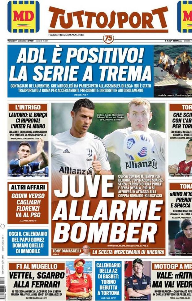 ULTIME NOTIZIE MILAN NEWS - 'Tuttosport' oggi in edicola, in prima pagina, parla della Juventus. Nel caso in cui non arrivi un bomber, come ad esempio Luís Suárez, il nuovo tecnico Andrea Pirlo, in attacco, si affiderebbe a Cristiano Ronaldo, Paulo Dybala e Dejan Kulusevski. In alto, sotto la testata, ampio spazio al caso di Aurelio De Laurentiis, Presidente del Napoli. Positivo al coronavirus, ha partecipato all'Assemblea di Lega con gli altri Presidenti. Per i quali, adesso, è scattato l'isolamento. Nei riquadri verticali si parla di calciomercato. L'Inter prova a respingere un nuovo assalto del Barcellona a Lautaro Martínez. Il tutto mentre Diego Godín va verso il Cagliari. Cessione per la Roma: Alessandro Florenzi, infatti, è ad un passo dal PSG. In casa Torino sono scintille con l'Arsenal per Lucas Torreira. Al Milan, invece, ecco le prime parole di Sandro Tonali da calciatore rossonero.