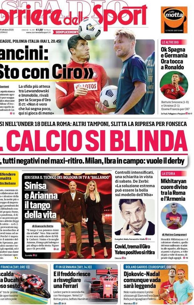 "ULTIME NOTIZIE MILAN NEWS - Il 'Corriere dello Sport' in edicola questa mattina dedica la sua copertina ai controlli a tappeto che stanno eseguendo le squadre di Serie A ai propri atleti. Obiettivo, evitare i contagi da coronavirus. Due casi nell'Under 18 della Roma, slitta la ripresa degli allenamenti anche per la squadra di Paulo Fonseca. L'Inter, che ha 5 positivi in squadra, è in ritiro e dagli ultimi controlli svolti non ha avuto altri problemi. Sabato prossimo c'è il derby e Zlatan Ibrahimović, sul fronte Milan, vuole essere in campo nonostante sia appena rientrato proprio dopo lo stop per il CoVid_19. In alto, sotto la testata, le parole di Roberto Mancini, C.T. della Nazionale, prima di Polonia-Italia, in campo questa sera a Danzica. Nel duello tra Robert Lewandowski e Ciro Immobile, lui sta con il laziale.