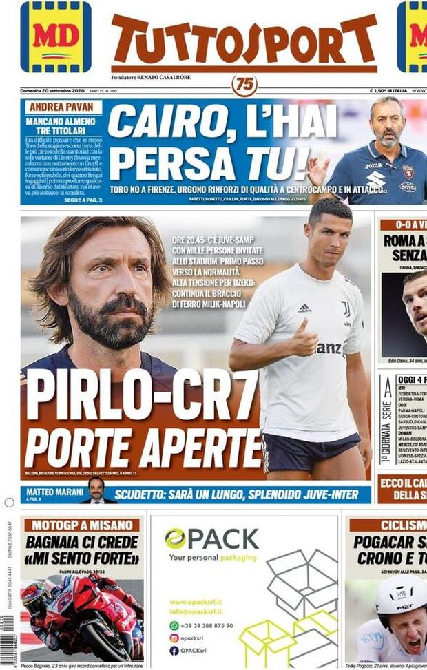 "ULTIME NOTIZIE MILAN NEWS - 'Tuttosport' concentra, nella sua prima pagina, tutte le attenzioni su Juventus-Sampdoria di questa sera. Andrea Pirlo debutta come allenatore bianconero e lo farà affidandosi, nell'assenza di un centravanti di ruolo, al solito Cristiano Ronaldo. All'Allianz Stadium porte aperte per 1000 invitati. In alto, sotto la testata, l'accusa del quotidiano ad Urbano Cairo, Presidente del Torino. I granata di Marco Giampaolo, infatti, perdono 0-1 a Firenze ma hanno grandi alibi. Dal mercato, finora, non è arrivato nessun rinforzo realmente di grido per una stagione di buon livello. Infine, un richiamo al pareggio, 0-0, della Roma sul campo dell'Hellas Verona. Il bosniaco Edin Dzeko è rimasto a guardare: nei prossimi giorni diventerà della Juventus.