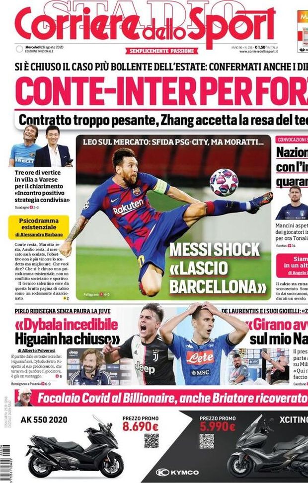 "ULTIME NOTIZIE MILAN NEWS - Il 'Corriere dello Sport' oggi in edicola apre, sotto la testata, con le ultime evoluzioni in casa Inter. Il tecnico Antonio Conte resta al suo posto (quanto per convinzione e quanto, invece, per motivi strettamente economici?) e con lui anche i dirigenti. Lionel Messi annuncia di voler lasciare il Barcellona: il PSG ed il Manchester City dell'amico Pep Guardiola sulle tracce della 'Pulce', ma Massimo Moratti, con le sue dichiarazioni, fa volare i tifosi nerazzurri. In basso, poi, spazio alle parole di Andrea Pirlo, tecnico della Juventus, che, di fatto, sanciscono il divorzio dal 'Pipita' Gonzalo Higuaín. Ha parlato anche Aurelio De Laurentiis, Presidente del Napoli, che si lamenta delle offerte al ribasso per i suoi gioielli Kalidou Koulibaly ed Arkadiusz Milik. Incubo quarantena sui convocati della Nazionale Italiana per le gare di Nations League. Per ora, in isolamento, ci sono Sandro Tonali e Jorginho.