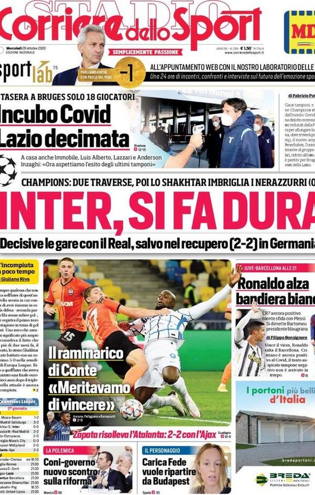 "ULTIME NOTIZIE MILAN NEWS - Il 'Corriere dello Sport' in edicola stamattina, in prima pagina, apre con Shakhtar Donetsk-Inter 0-0 di Champions League. Traverse di Nicolò Barella e Romelu Lukaku per i nerazzurri, poi imbrigliati dal catenaccio degli ucraini. Antonio Conte rammaricato: ora dovrà andare a vincere a Madrid. In alto, sotto la testata, si parla di Bruges-Lazio di questa sera. I biancocelesti sono andati in Belgio con appena 18 calciatori. Il resto della truppa di Simone Inzaghi è rimasto a Roma: l'incubo coronavirus aleggia sulla compagine capitolina. Atalanta-Ajax è finita 2-2: doppio Duván Zapata per la 'Dea'. Nel riquadro verticale, quindi, si parla di Juventus-Barcellona di questa sera all'Allianz Stadium. Salta la sfida tra Cristiano Ronaldo e Lionel Messi: il portoghese è ancora positivo al CoVid_19.