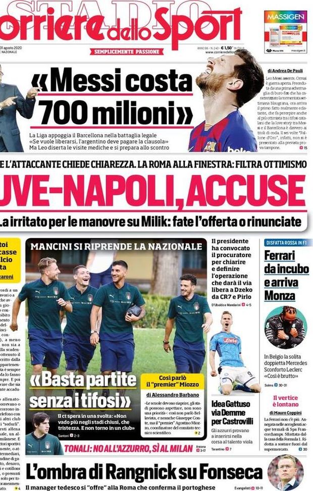 "ULTIME NOTIZIE MILAN NEWS - Il 'Corriere dello Sport' oggi in edicola, in prima pagina, riporta le accuse di Aurelio De Laurentiis, Presidente del Napoli, alla Juventus. Il club bianconero, infatti, ha 'bloccato' Arkadiusz Milik, ma senza presentare offerte. E il polacco, per gli azzurri, rappresenta una potenziale fonte di introito in una trattativa con la Roma. Il Napoli, intanto, pensa a cedere Diego Demme per prelevare, dalla Fiorentina, il talento Gaetano Castrovilli. In alto, sotto la testata, si parla di Lionel Messi: secondo la Liga è valida la clausola rescissoria di 700 milioni di euro e, quindi, l'argentino non può andare a costo zero al Manchester City. In basso, le parole di Roberto Mancini, Commissario Tecnico della Nazionale Italiana e il sì di Sandro Tonali al trasferimento al Milan. Infine, l'ombra di Ralf Rangnick su Paulo Fonseca in casa giallorossa.
