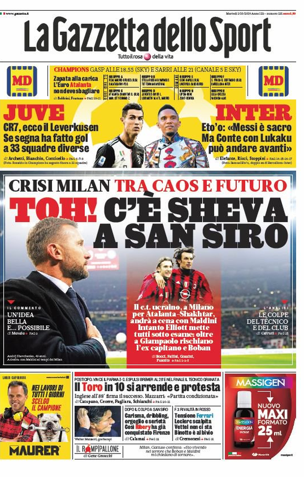 Ecco le prime pagine di oggi, martedì 1 ottobre 2019 de 'La Gazzetta dello Sport', 'Corriere dello Sport' e 'Tuttosport'. In primo piano la situazione in casa Milan con la panchina di Marco Giampaolo sempre più a rischio e il possibile arrivo secondo la rosea di Andriy Shevchenko attuale ct dell'Ucraina. Elliott, intanto, mette tutti sotto esame e rischiano pure Maldini e Boban.