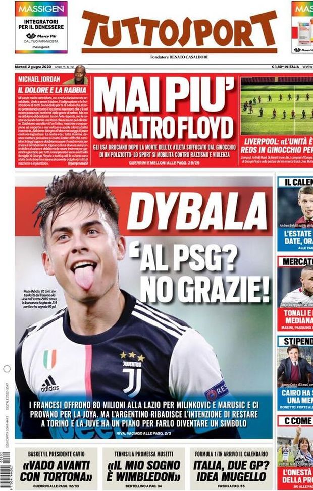 "MILAN NEWS - Chiusura con 'Tuttosport' che, sotto la testata, torna sulla scomparsa di George Floyd, avvenuta a Minneapolis in circostanze tutt'altro che chiare, soffocato dal ginocchio di un poliziotto e per il quale il mondo dello sport statunitense si sta mobilitando. Anche in Europa non mancano le manifestazioni di sostegno in memoria di Floyd. A centro pagina, il 'no' della Juventus al PSG per Paulo Dybala. La 'Joya', ad ogni modo, vuole restare in bianconero per diventare un simbolo della 'Vecchia Signora'. I parigini ci provano anche con la Lazio, offrendo 80 milioni di euro per avere l'accoppiata Adam Marusic-Sergej Milinkovic-Savic. Nel riquadro verticale, sulla destra, spazio al calendario di Serie A, all'Inter che, con Sandro Tonali e Radja Nainggolan, si rifà il trucco a centrocampo e ad Urbano Cairo, Presidente del Torino, che ha saldato una mensilità degli stipendi arretrati ai suoi calciatori.