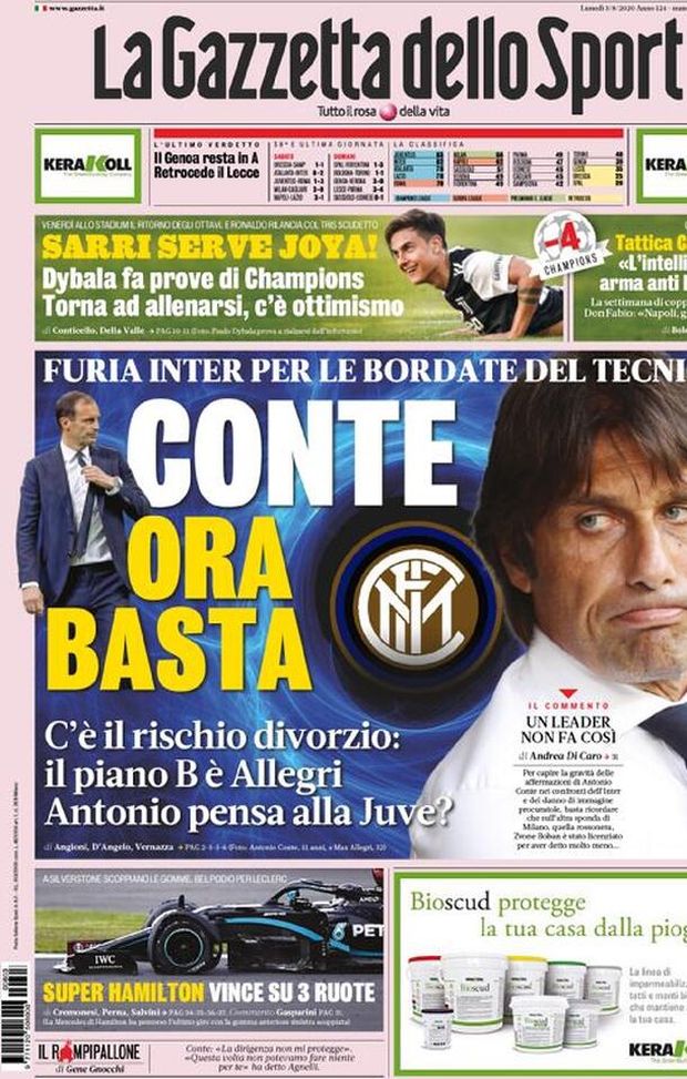 MILAN NEWS - Ecco le prime pagine di oggi, lunedì 3 agosto 2020 de 'La Gazzetta dello Sport', 'Corriere dello Sport' e 'Tuttosport'. In primo piano tiene banco il caso Antonio Conte dopo le parole del tecnico dell'Inter al termine della gara vinta contro l'Atalanta. Ora il suo futuro è incerto e al suo posto i nerazzurri potrebbero puntare su Massimiliano Allegri.