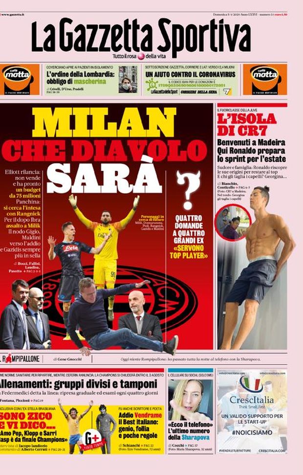 Ecco le prime pagine di oggi, domenica 5 aprile 2020 de 'La Gazzetta dello Sport', 'Corriere dello Sport' e 'Tuttosport'. In primo piano sulla rosea il futuro della squadra rossonera con tanti interrogativi da risolvere sia sul piano tecnico che su quello dirigenziale. Da Pioli a Maldini, passando per Ibrahimovic e Donnarumma: tanti i rossoneri dal futuro incerto.