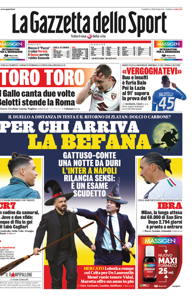 Ecco le prime pagine di oggi, lunedì 6 gennaio 2020 de 'La Gazzetta dello Sport', 'Corriere dello Sport' e 'Tuttosport'. In primo piano il ritorno della Serie A dopo le feste di Natale, con il big match tra Napoli e Inter e la vittoria di ieri del Torino all'Olimpico contro la Roma. Spazio anche al Milan, con Ibrahimovic che quest'oggi dovrebbe partire dalla panchina contro la Sampdoria. A tra poco per la rassegna stampa completa!