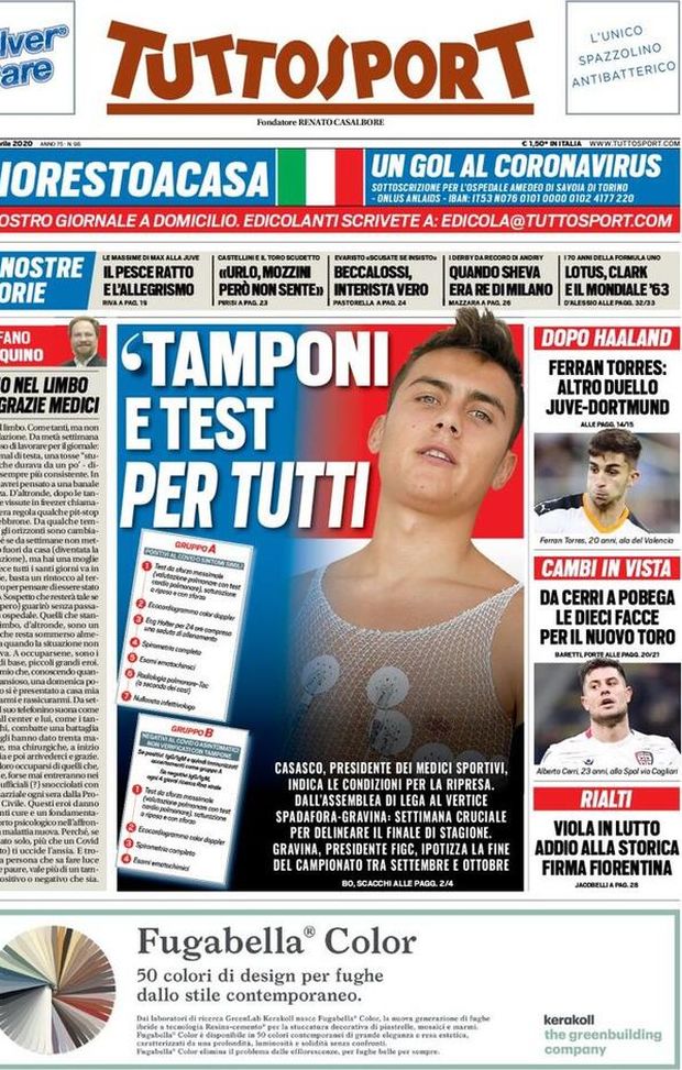"NEWS MILAN - Infine, 'Tuttosport', nella sua copertina, ha spiegato come, prima della ripresa delle attività sportive, i calciatori saranno sottoposti a tamponi e test per prevenire ulteriore contagi e diffusione del coronavirus. Mentre in alto, sotto la testata, il quotidiano torinese riporta alla luce le sue storie del calciomercato passato (tra cui l'arrivo di Andriy Shevchenko al Milan nel 1999), nel riquadro verticale si parla del mercato che sarà in estate: la Juventus punta Ferrán Torres del Valencia, seguito anche dal Borussia Dortmund, mentre il Torino ha messo nel mirino ben 10 calciatori, tra cui Tommaso Pobega, centrocampista di proprietà del Milan ma, in questa stagione, in prestito al Pordenone in Serie B.