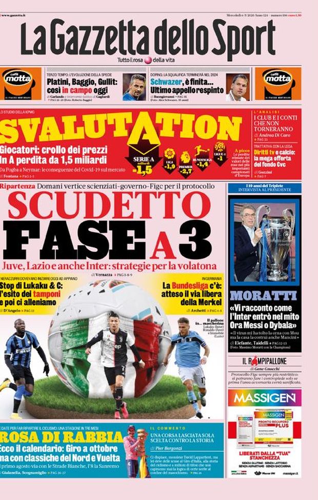 Ecco le prime pagine di oggi, mercoledì 6 maggio 2020 de 'La Gazzetta dello Sport', 'Corriere dello Sport' e 'Tuttosport'. In primo piano la volata Scudetto tra Juve, Lazio e Inter. Interviste esclusiva di Massimo Moratti alla Gazzetta e Giorgia Meloni - leader di Fratelli D'Italia - al Corriere dello Sport.