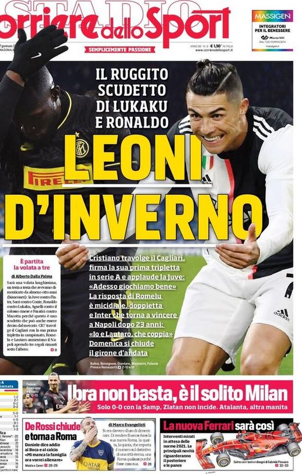 "NEWS MILAN - Anche il 'Corriere dello Sport', in prima pagina, schiera la coppia pesante: Romelu Lukaku e Cristiano Ronaldo, simboli di Inter e Juventus, appaiate in vetta alla classifica di Serie A e in lotta per la conquista dello Scudetto. I nerazzurri non passavano al 'San Paolo' in campionato dal 18 ottobre 1997, mentre per il portoghese si tratta della prima tripletta nel campionato italiano. Spazio, quindi, al nuovo debutto rossonero di Zlatan Ibrahimovic: lo svedese, però, non riesce ad incidere come vorrebbe e Milan-Sampdoria è terminata 0-0. Infine, l'addio al calcio di Daniele De Rossi, che lascia il Boca Juniors e torna nella Capitale: farà l'allenatore.