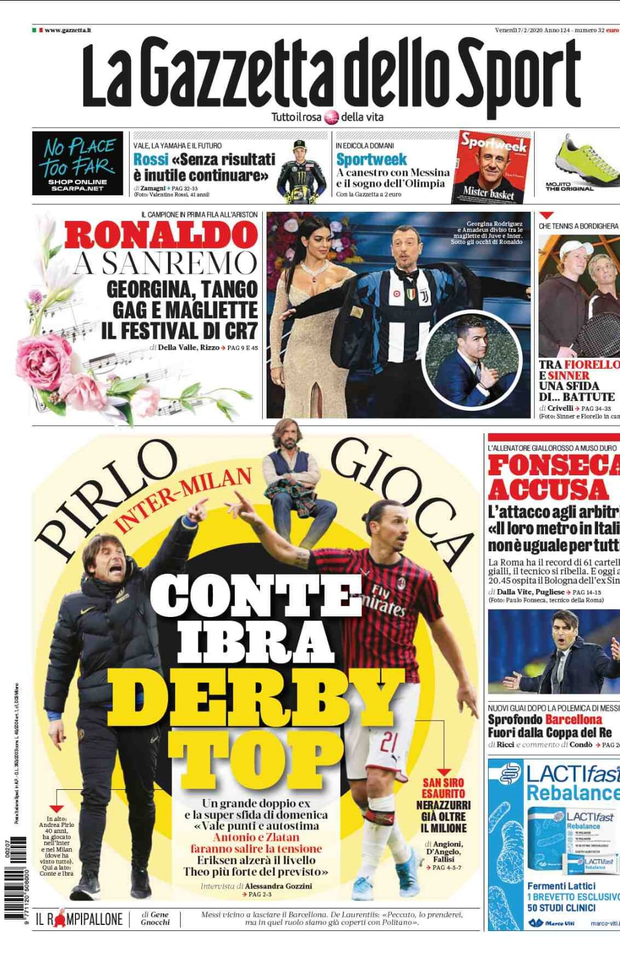 Ecco le prime pagine di oggi, venerdì 7 febbraio 2020 de 'La Gazzetta dello Sport', 'Corriere dello Sport' e 'Tuttosport'. In primo piano il derby di Milano che si avvicina sempre di più. Sulle pagine della rosea il doppio ex della sfida Andrea Pirlo ha "giocato" la stracittadina rispondendo a diverse domande sul tema.