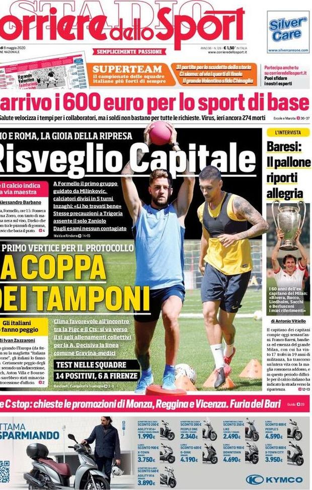 "MILAN NEWS - Il 'Corriere dello Sport', in prima pagina, parla della ripresa degli allenamenti di Lazio e Roma, le due squadre della Capitale, e dei primi test sulle compagini di Serie A, che hanno portato già a 14 casi di positività al CoVid_19, di cui ben 6 nella Fiorentina tra calciatori e staff. Nel riquadro verticale, spazio all'intervista con Franco Baresi, colonna del Milan per 20 anni, nel giorno del suo compleanno. In basso, poi, lo stop al campionato di Serie C per l'emergenza coronavirus, che, presumibilmente, porterà in Serie B il Monza di Silvio Berlusconi, la Reggina ed il Vicenza. Rischia di essere tagliato fuori il Bari in favore del Carpi.