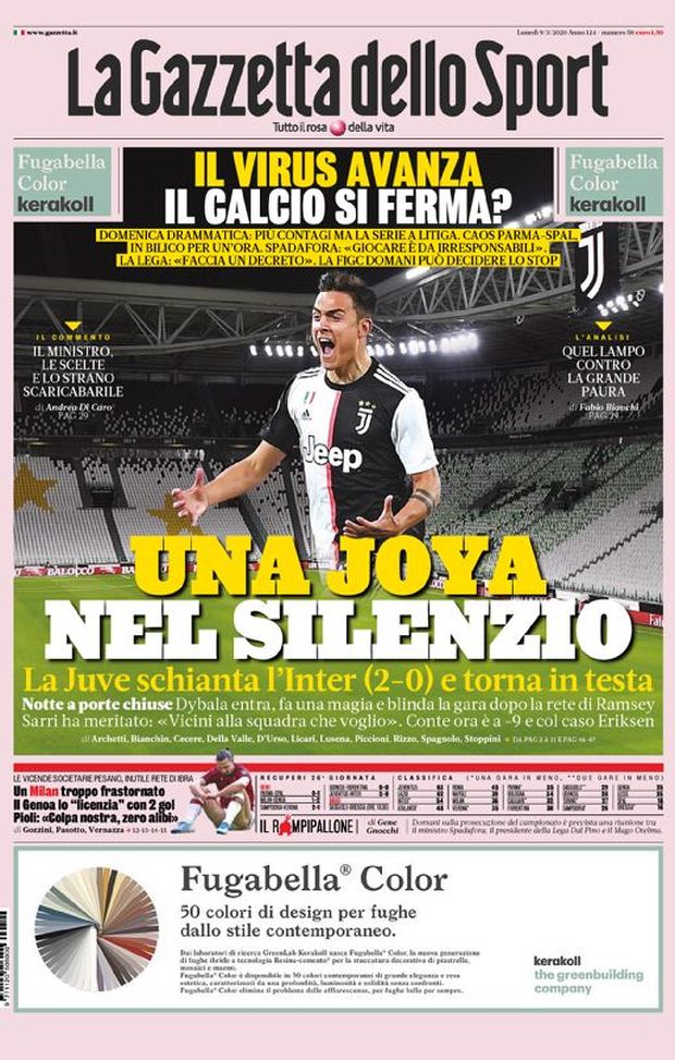 Ecco le prime pagine di oggi, lunedì 9 marzo 2020 de 'La Gazzetta dello Sport', 'Corriere dello Sport' e 'Tuttosport'. In primo piano i risultati dei recuperi della 26^ giornata con la vittoria della Juventus contro l'Inter per 2-0 nel match Scudetto di Torino. Il Milan, invece, crolla in casa contro il Genoa 2-1: inutile la quarta rete di Ibrahimovic in stagione.