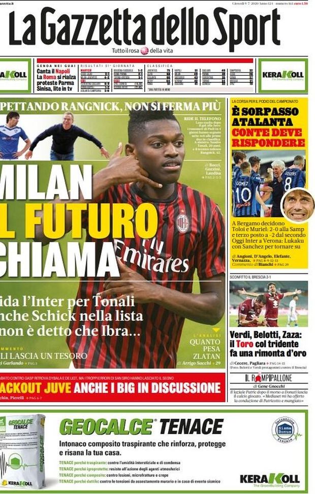 Milan sui media, le prime pagine dei giornali di oggi (09/07/2020)