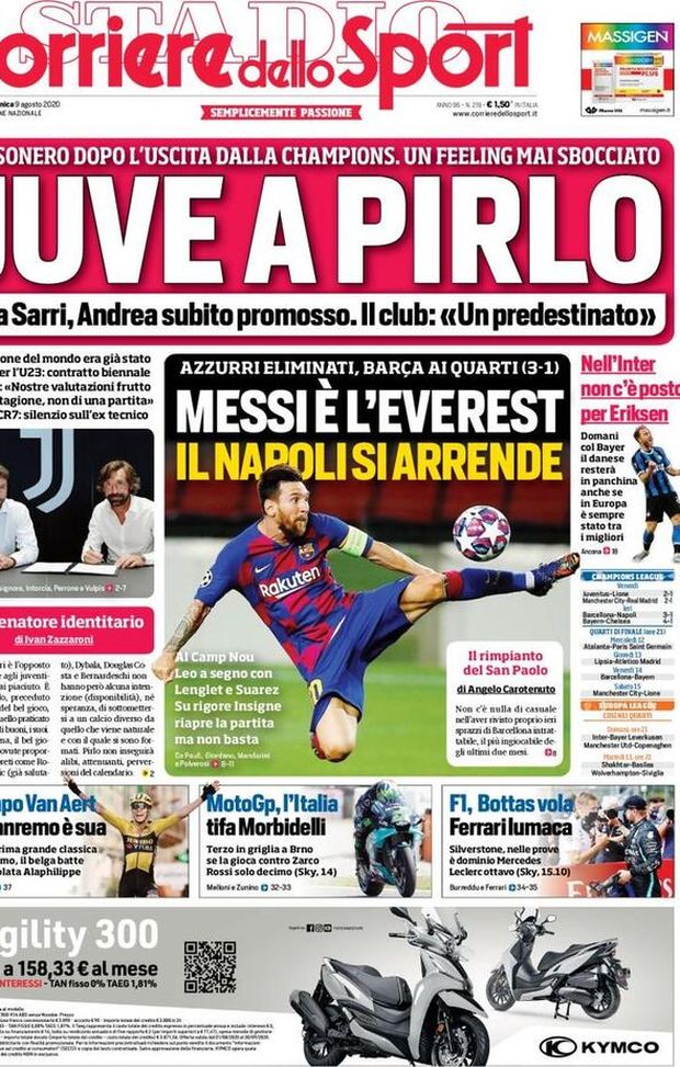 "ULTIME NOTIZIE MILAN NEWS - Anche il 'Corriere dello Sport' apre, in prima pagina, con l'arrivo di Andrea Pirlo sulla panchina della Juventus. L'ormai ex tecnico bianconero, Maurizio Sarri, esonerato all'indomani dell'inutile vittoria interna, 2-1, contro l'Olympique Lione, che non è stata sufficiente per raggiungere le 'Final Eight' di Champions League a Lisbona. Per la Juventus, Pirlo è "un predestinato". Quindi, nel riquadro centrale della prima del quotidiano romano, spazio a Barcellona-Napoli, terminata 3-1 per i blaugrana (che Lionel Messi!) e che ha contribuito a rispedire a casa gli azzurri di Gennaro Gattuso: la loro stagione 2019-2020 finisce qui. Infine, nel riquadro verticale, si parla dei tormenti di Christian Eriksen, classe 1992, centrocampista danese che fatica a trovare spazio nell'Inter di Antonio Conte. Resterà in panchina anche domani sera, in occasione della sfida secca di Europa League contro il Bayer Leverkusen in programma a Düsseldorf.