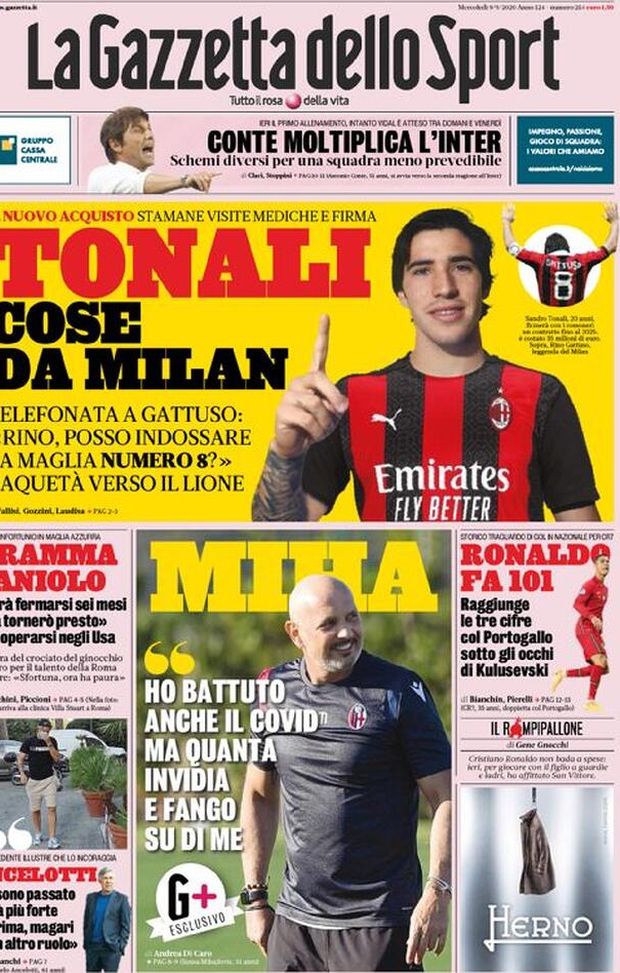 ULTIME NOTIZIE MILAN NEWS - Ecco le prime pagine di oggi, mercoledì 9 settembre 2020 de 'La Gazzetta dello Sport', 'Corriere dello Sport' e 'Tuttosport'. In primo piano le visite mediche di Sandro Tonali, in programma questa mattina presso la clinica 'La Madonnina'. Attenzione anche al rinnovo di Gianluigi Donnarumma: il Milan deve fare uno sforzo in più per trattenere il suo portiere.