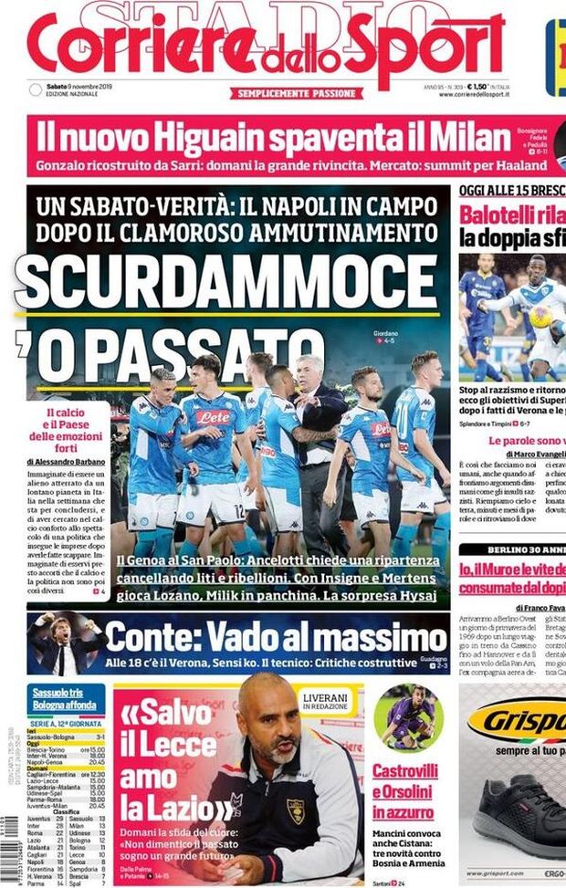 Milan sui media, le prime pagine dei giornali di oggi (09/11/2019)