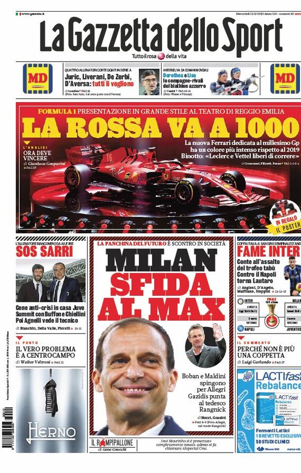 Ecco le prime pagine di oggi, mercoledì 12 febbraio 2020 de 'La Gazzetta dello Sport', 'Corriere dello Sport' e 'Tuttosport'. In primo piano il possibile ritorno sulla panchina del Milan di Massimiliano Allegri, con Gazidis che però vorrebbe un profilo più internazionale come quello di Rangnick. Nel taglio alto spazio alla presentazione della nuova Ferrari.