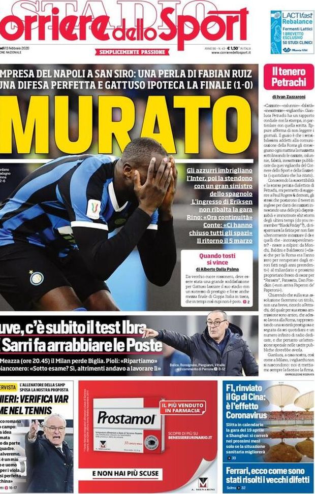Milan sui media, le prime pagine dei giornali di oggi (13/02/2020)