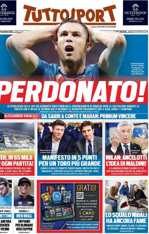Milan sui media, le prime pagine dei giornali di oggi (13/11/2019)